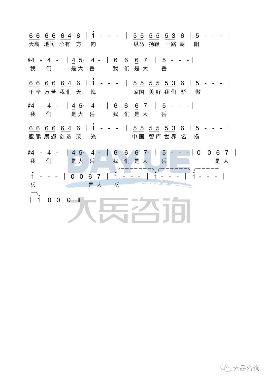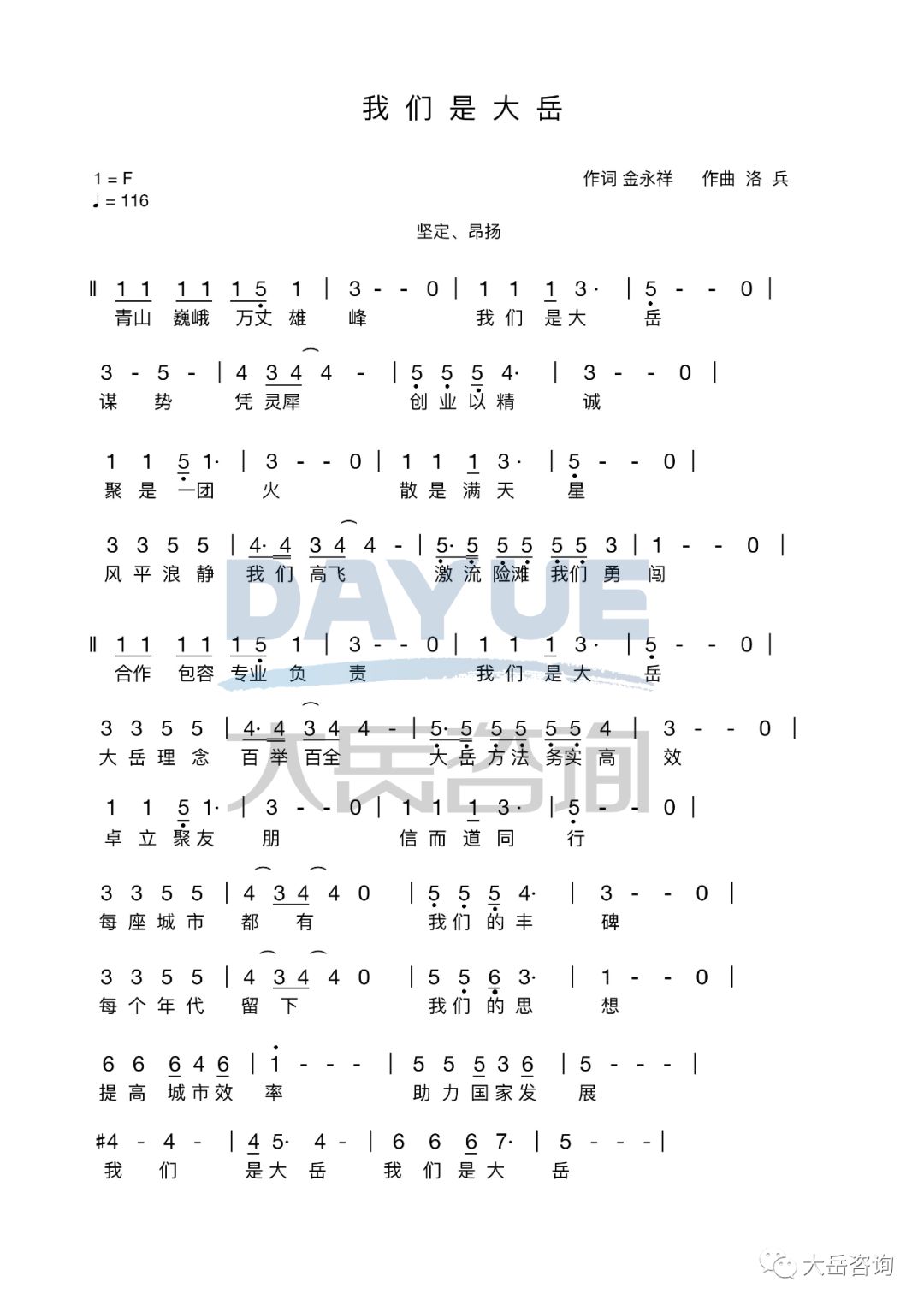 《我們是大岳》是大岳咨詢公司的司歌,由董事長(zhǎng)金永祥作詞、著名作曲家洛兵作曲,大岳合唱團(tuán)演繹,于2018年10月25日在京首發(fā)。
