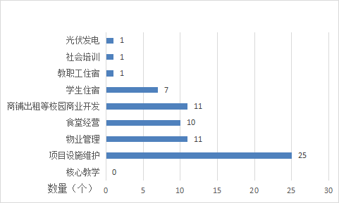 按照項目公司運營內容是否包含教學內容等核心業(yè)務,公立高等學校PPP項目可以分為兩類。實踐中,由于高校教學任務的特殊性、專業(yè)性以及教育領域企業(yè)傾向于輕資產(chǎn)運營等原因,較多公立高等學校PPP項目核心教學任務由學校開展,非核心教學內容交由項目公司負責。全國PPP綜合信息平臺管理庫顯示共有25個高等學校PPP項目進入執(zhí)行階段并滿6個月(此時可對外公示項目實施方案等信息),其項目運營維護內容集中于項目設施維護、物業(yè)管理、食堂經(jīng)營、學生住宿和商鋪出租等商業(yè)開發(fā)。