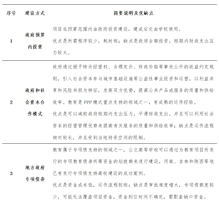 根據(jù)《政府投資條例》、《防范和化解地方政府隱性債務風險的意見》(中發(fā)〔2018〕27號)等法規(guī)政策精神,目前公立高等學校主要有以下幾種建設方式: