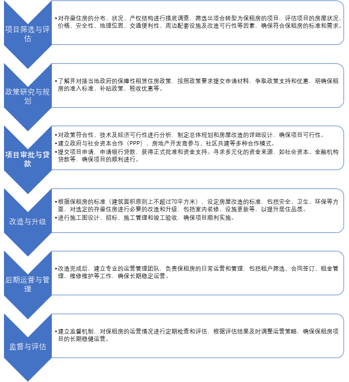 存量房屋改造為保租房的項目是一個涵蓋多個關(guān)鍵環(huán)節(jié)的系統(tǒng)性過程: