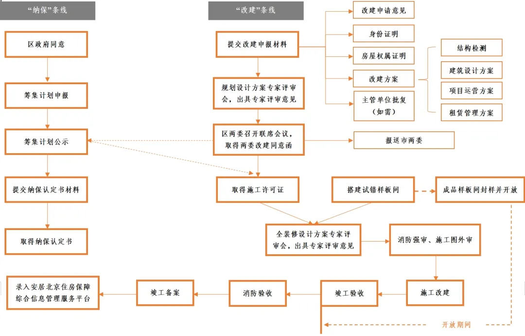 項目的申請和審批有“納保”和“改建”兩種方式:“納保”指經(jīng)政府同意后,項目納入保障性租賃住房年度建設(shè)籌集計劃,并取得保障性租賃住房項目認定書,繼而享受國家政策優(yōu)惠的過程;“改建”指實施主體按照有關(guān)要求將現(xiàn)有存量建筑裝修改建為保障性租賃住房的過程。流程具體如下圖(以北京市為例):