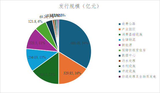 從發(fā)行規(guī)模看,收費(fèi)公路類項(xiàng)目占比最大,達(dá)到34%;產(chǎn)業(yè)園區(qū)和消費(fèi)基礎(chǔ)設(shè)施緊隨其后,占比分別為16%和15%,前三類項(xiàng)目合計(jì)發(fā)行規(guī)模約1320億元,占總規(guī)模的65%。