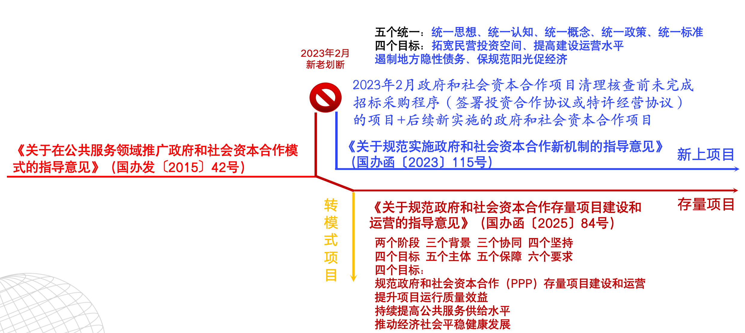 《關(guān)于規(guī)范實(shí)施政府和社會(huì)資本合作新機(jī)制的指導(dǎo)意見》(國辦函〔2023〕115號(hào)):明確2023年2月為“新老劃斷”節(jié)點(diǎn),此后新上項(xiàng)目適用新機(jī)制。
