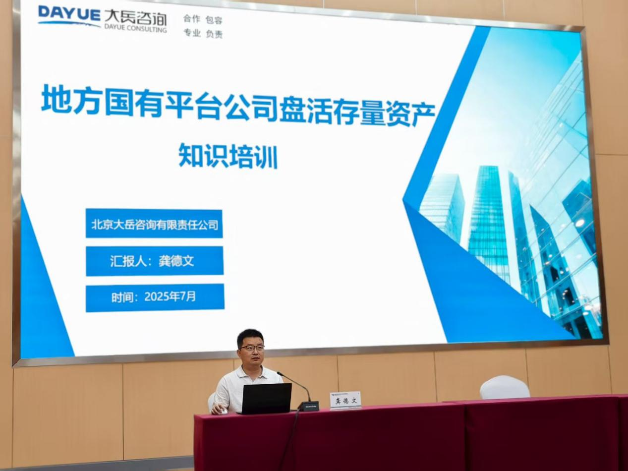 2025年7月18日,大岳咨詢首席行業(yè)專家龔德文總監(jiān)受邀為羅田國有資本投資運營集團有限公司“國有企業(yè)領導干部綜合能力提升專題培訓班”授課。這是繼此前龔總監(jiān)受邀為集團開展投融資專題后的又一次培訓交流。本次培訓以《地方國有平臺公司盤活存量資產知識培訓》為主題,聚焦盤活存量資產核心議題,深入解讀其政策背景與實操路徑、地方平臺公司融資要點,并結合最新政策形勢與實操案例進行分享。此次培訓旨在為地方國企干部提供專業(yè)賦能,助力能力提升。