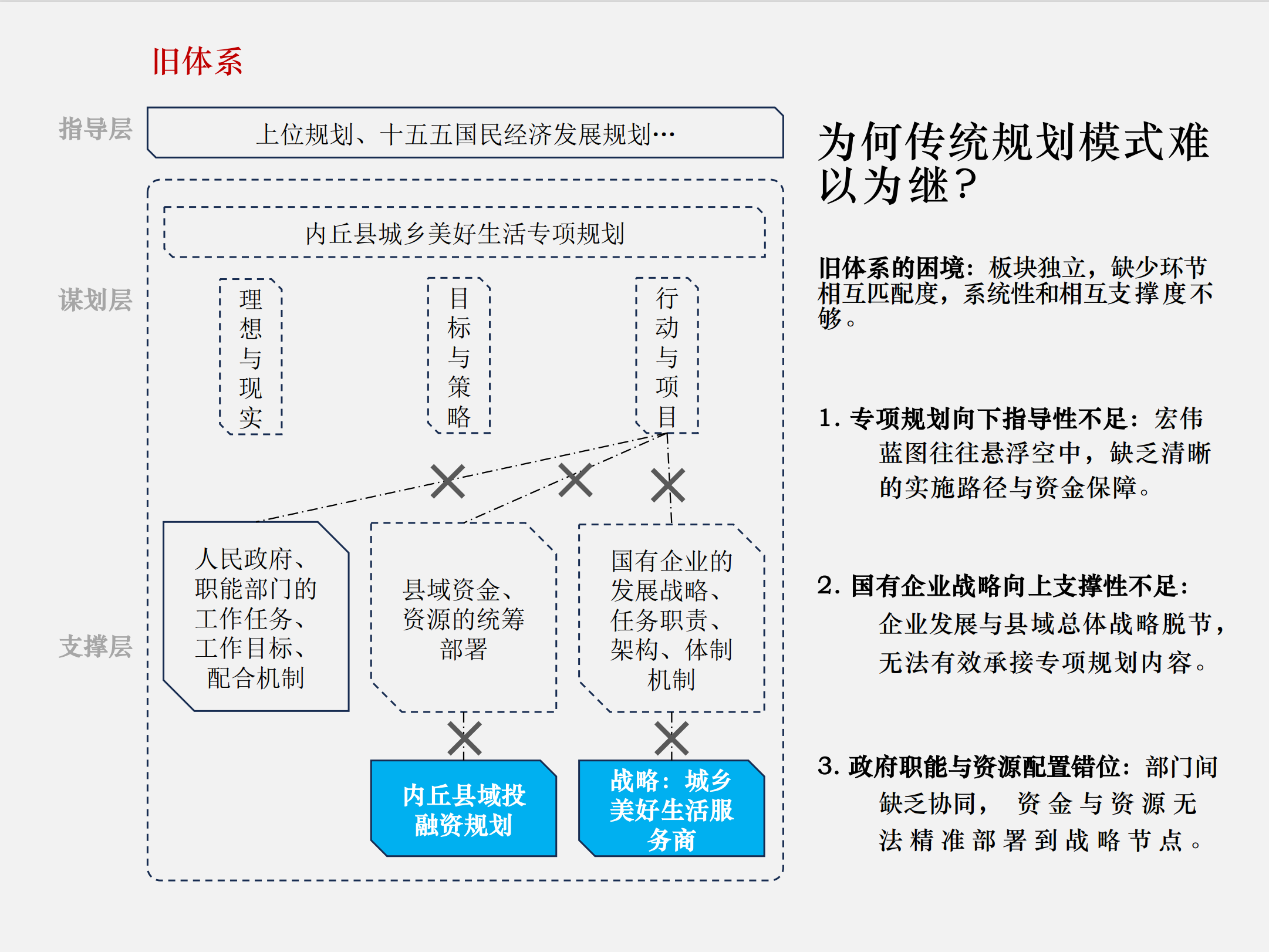 會上,大岳區(qū)域總經(jīng)理王超圍繞“城鄉(xiāng)美好生活服務(wù)商”戰(zhàn)略落實(shí)展開系統(tǒng)性講解。針對傳統(tǒng)發(fā)展模式下存在的規(guī)劃落地成效不足、資金統(tǒng)籌能力薄弱、部門協(xié)同聯(lián)動不暢、國企對接偏差錯(cuò)位等核心痛點(diǎn),提出“規(guī)劃引領(lǐng)-投融資統(tǒng)籌-部門協(xié)同-國企承接”一體化驅(qū)動轉(zhuǎn)型思路,并解讀了項(xiàng)目謀劃、板塊銜接、權(quán)責(zé)劃分、投融資匹配等關(guān)鍵議題。