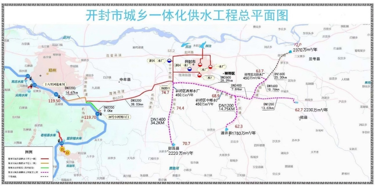 開封市城鄉(xiāng)一體化供水工程是鄭開同城東部供水工程的配套工程,是河南省重點水利工程項目。建設(shè)內(nèi)容主要為新建以南水北調(diào)水為水源的重力輸水管道,以及配套的輸水管線安全監(jiān)測系統(tǒng)、管理設(shè)施,供水總規(guī)模為9950萬立方米/年,總投資約25.40億元。工程建成后將有效緩解蘭考縣、尉氏縣、通許縣、杞縣和祥符區(qū)水資源供需矛盾,提升南水北調(diào)用水效益。